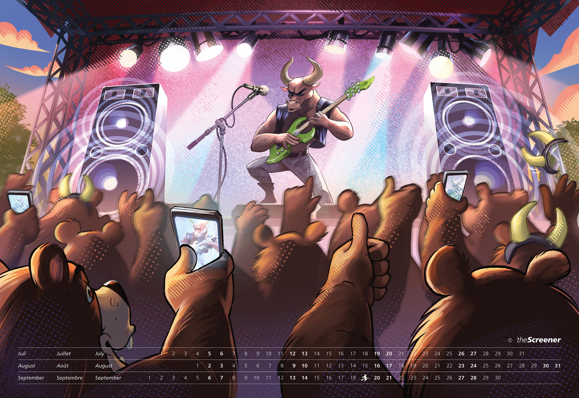 Im aktuellen Jahr begegnen sich Bulle und Bär als leidenschaftliche Musiker – im wahrsten Sinne des Wortes. Durchs Jahr dirigiert werden die beiden Talente vom Stift des äusserst originellen Zeichners Artur Fast aus Deutschland.